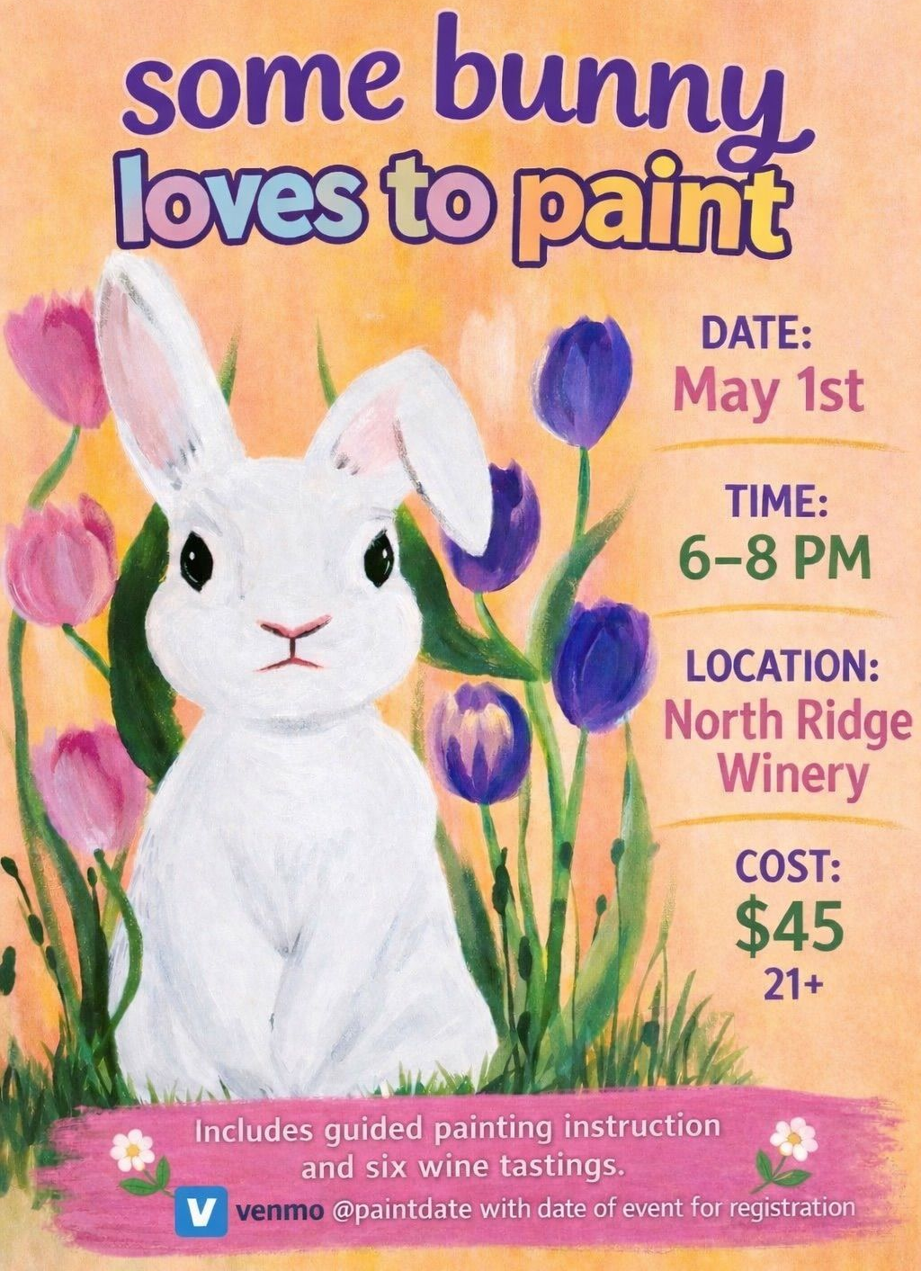 Welcome Spring with this whimsical bunny paint class. All supplies included. Includes a wine tasting,